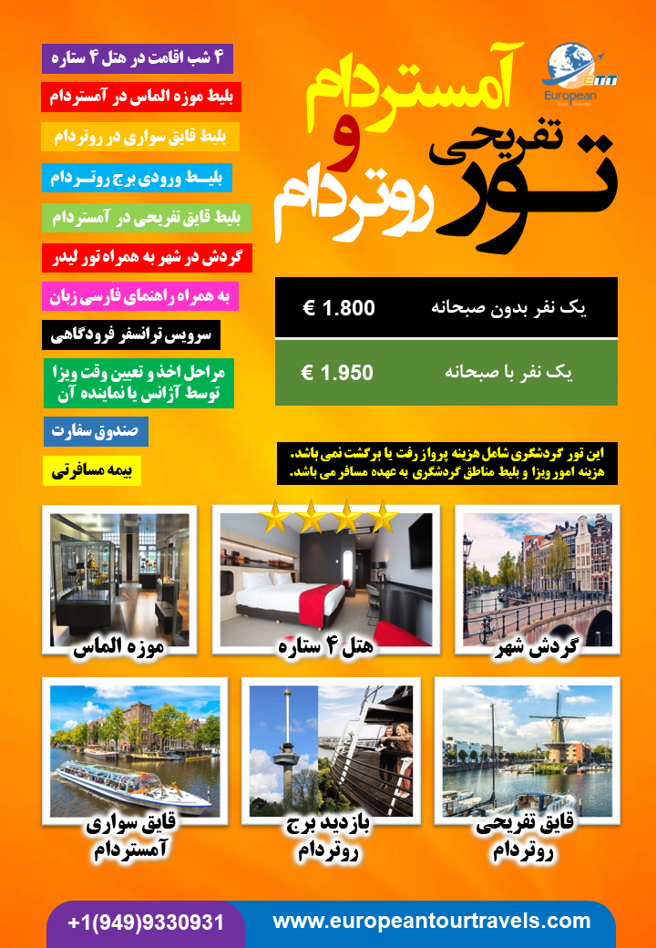 توتور گردشگری و تفریحی آمستردام و روتردام با بلیط های متنوع جهت بازدید و گردش و مزایای مختلف سفر قابل رزرو می باشد ، تاریخ : 15 اکتبر