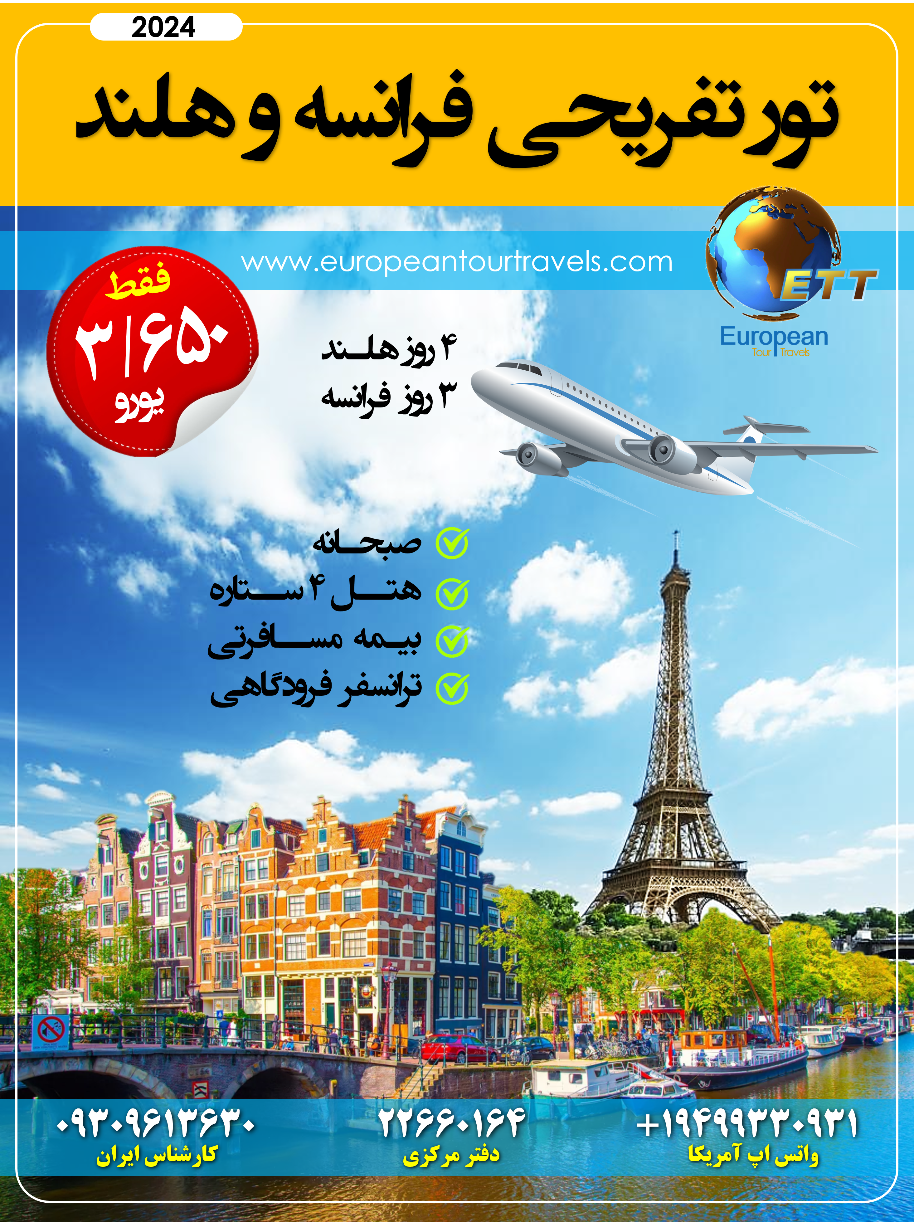 پاریس و آمستردام 10 ژانویه 2025 4 روز فرانسه و 3 روز هلند به همراه هتل 4 ستاره و صبحانه و بیمه مسافرتی و سرویس ترانسفر فرودگاهی + اخذ ویزای شینگن جهت ثبت نام یا کسب اطلاعات بیشتر با ما تماس بگیرید