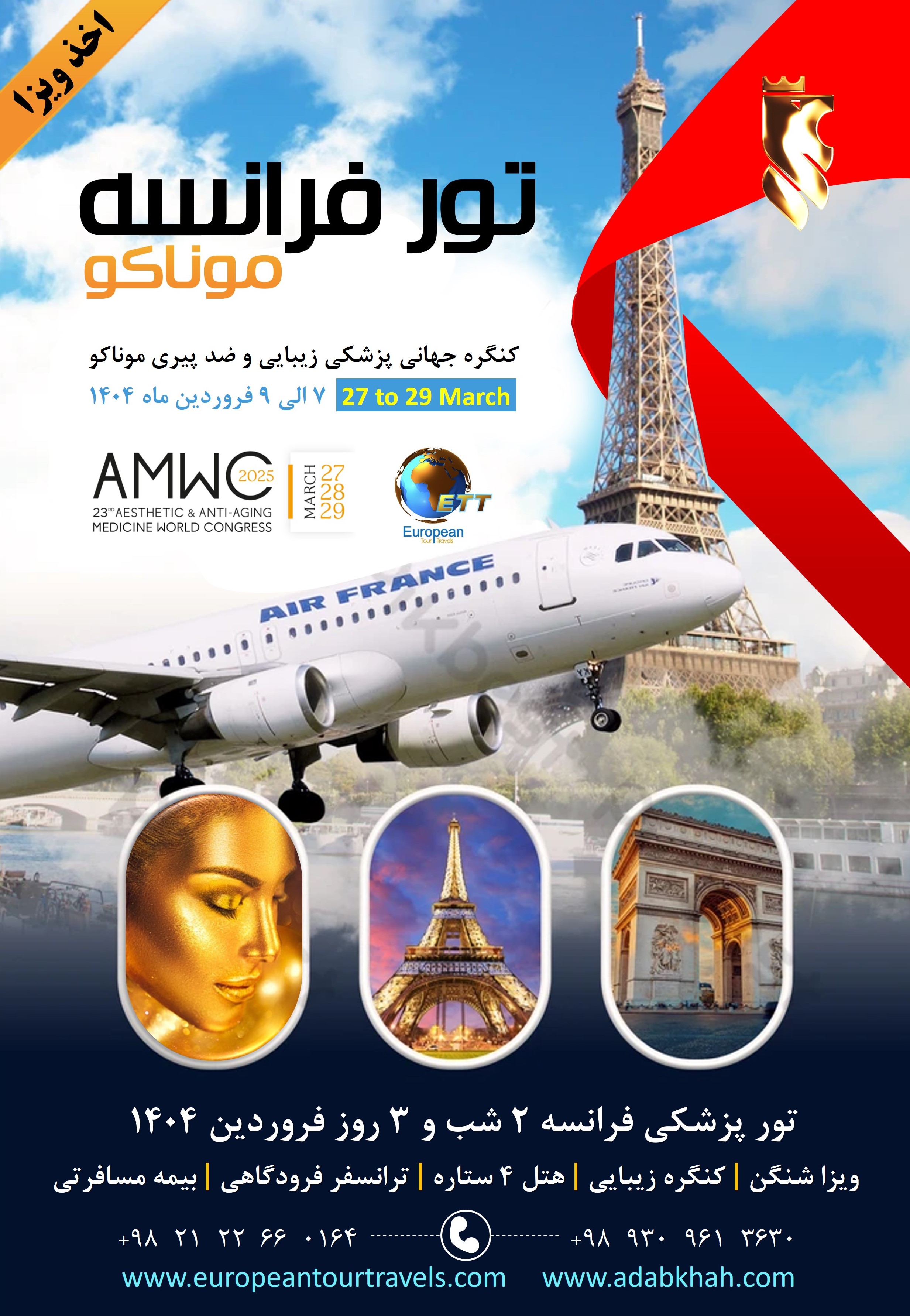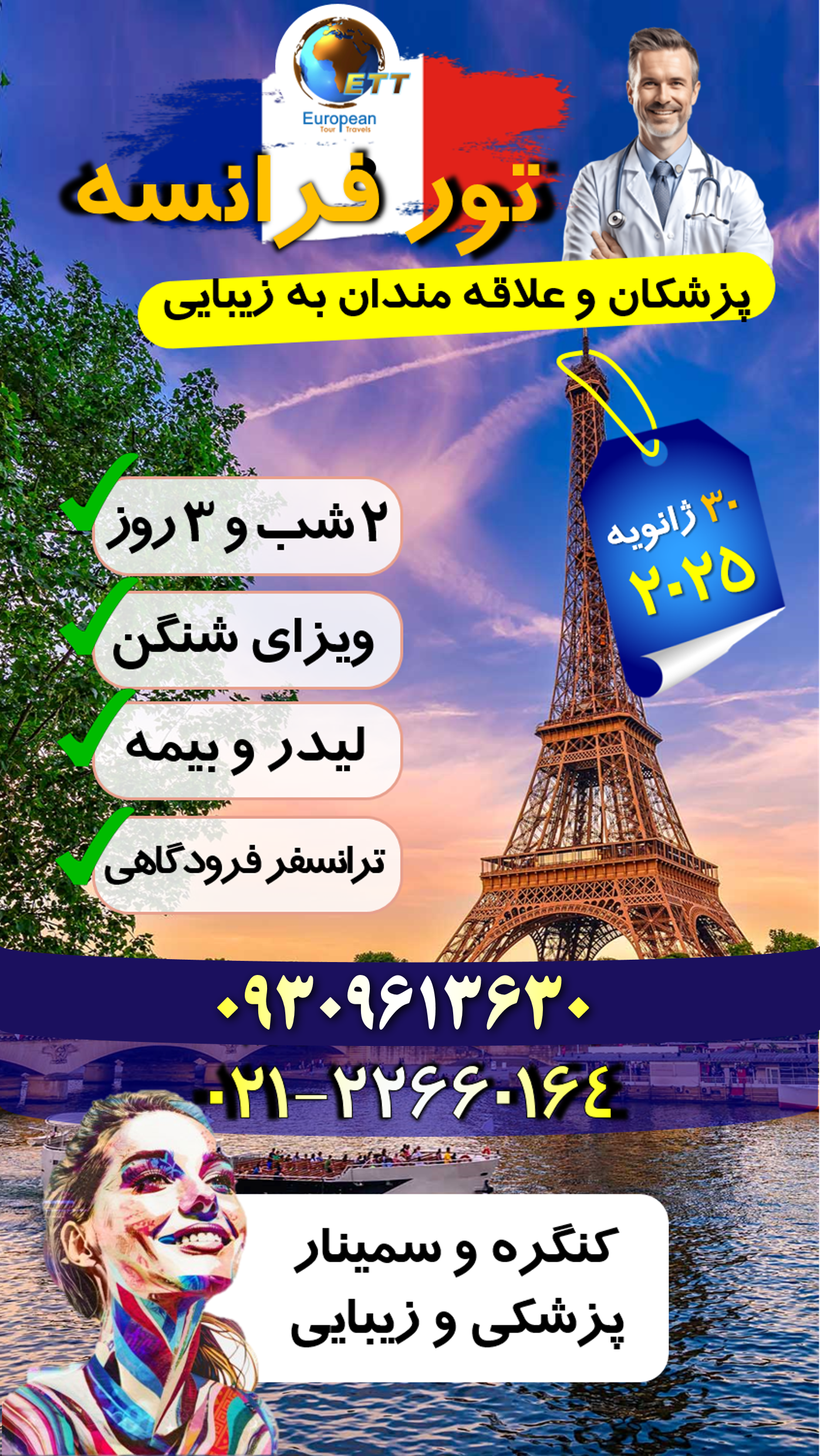 پزشکان محترم و علاقه مندان به زیبایی 30 ژانویه 2025 تور فرانسه 2 شب و 3 روز با بهترین نرخ و امکانات برگزار می شود.